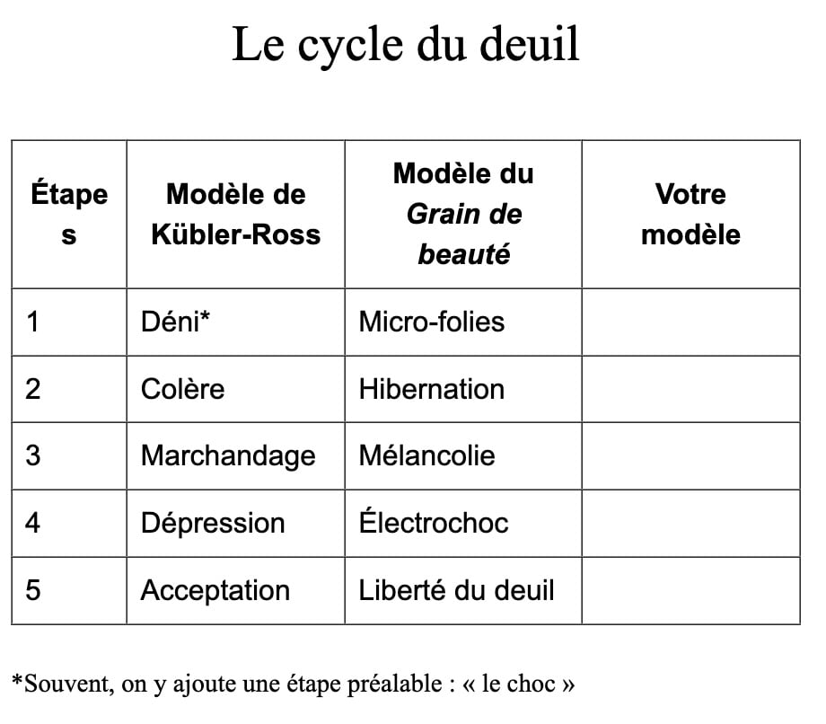 Dans son livre, Mathieu Simonet, interroge le cycle du deuil définit par Elizabeth Kübler-Ross et propose son propre séquençage.